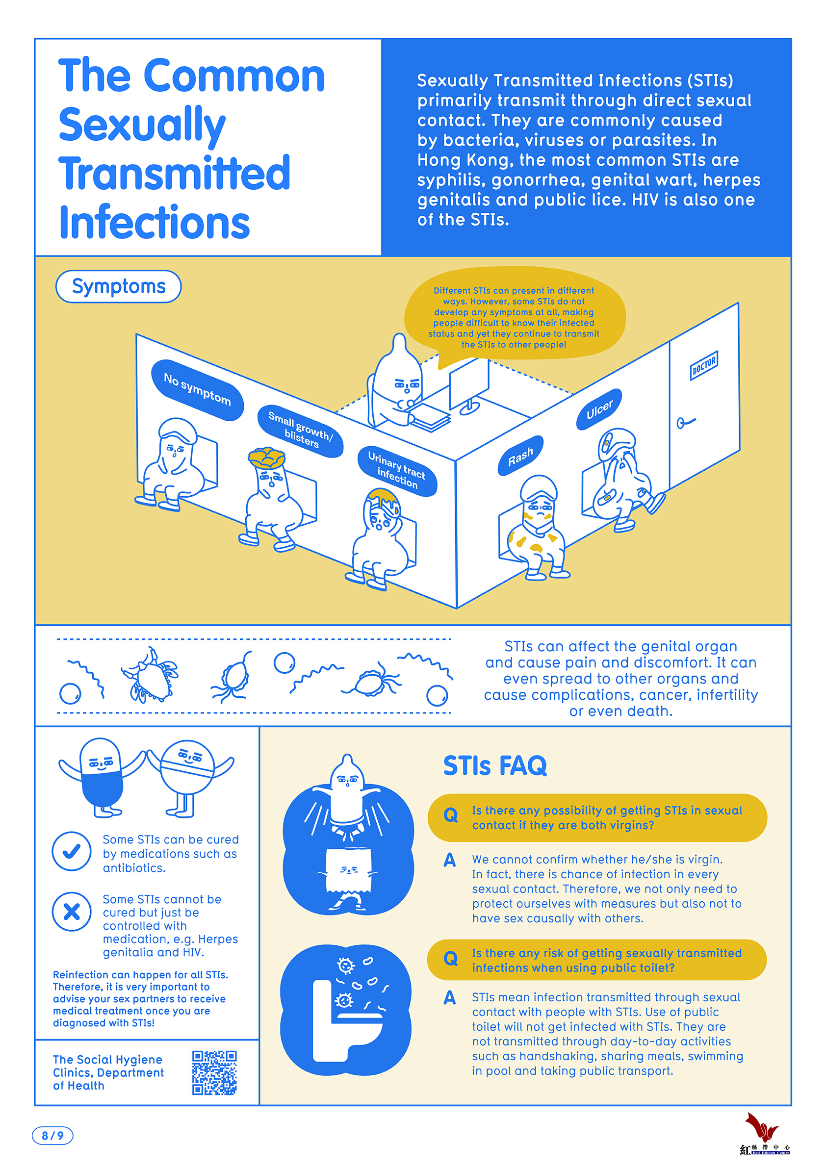 Sexually Transmitted Infections (STIs) primarily transmit through direct sexual contact. They are commonly caused by bacteria, viruses or parasites. In Hong Kong, the most common STIs are syphilis, gonorrhoea, genital wart, herpes genitalis and pubic lice. HIV is also one of the STIs.
